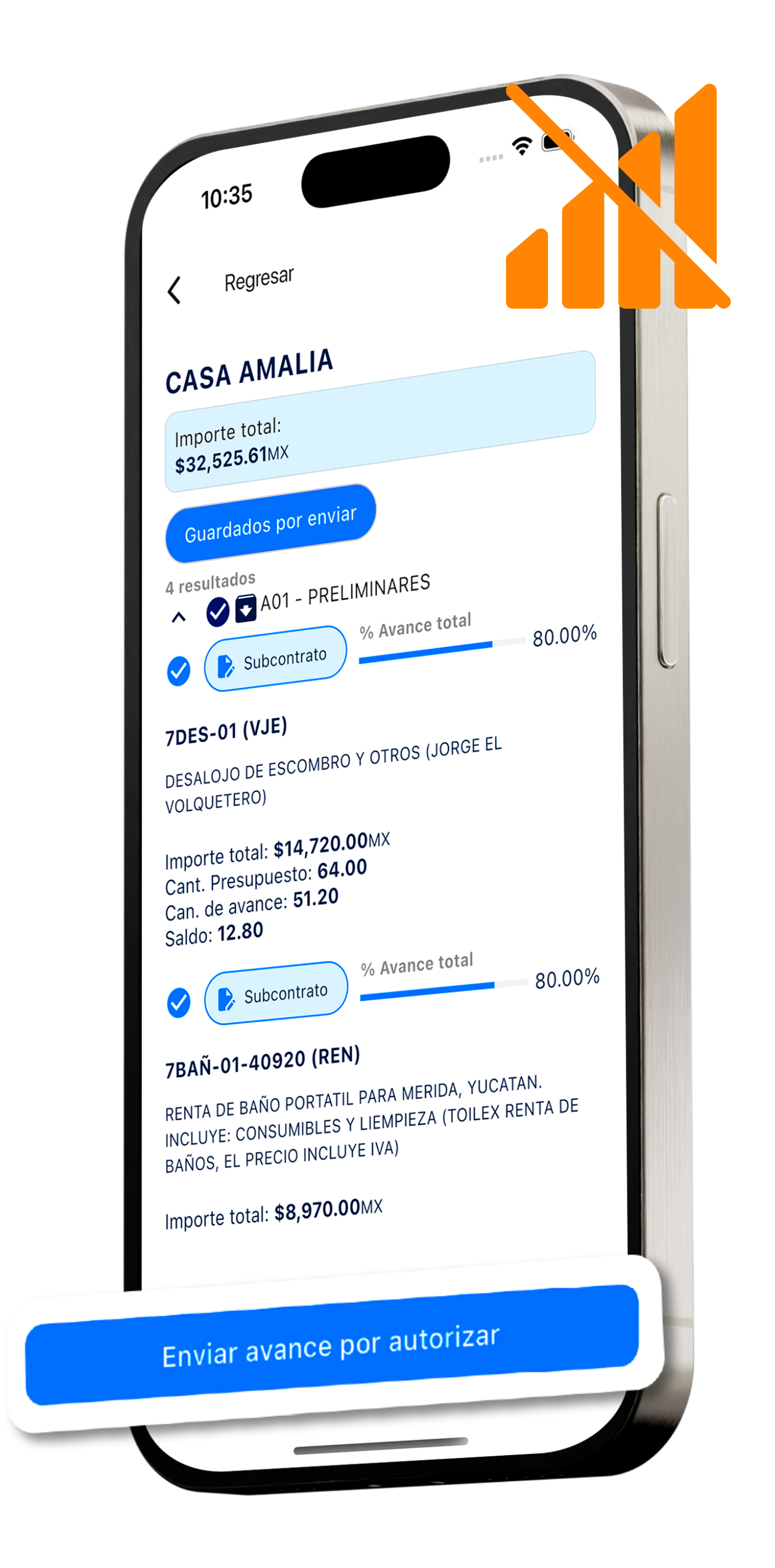 Permite registrar el avance de obra, evidencia y notas sin conexión a internet, asegurando continuidad operativa en cualquier etapa del proyecto.
